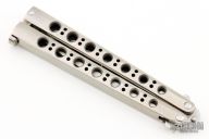 This Model 42 by Benchmade features a satin finished blade with swedge. The handles are satin finished titanium with T-latch. Comes with original sheath. Has scuffs and scratches, has been resharpened, good condition otherwise.