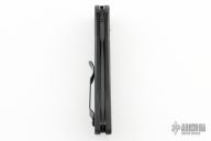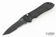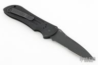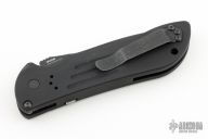This 9101SBK AUTO Stryker from Benchmade features a black coated drop point tanto style blade with swedge, notched thumb rest and partial serrations. The handle is comprised of milled black aluminum frame with a black coated stainless steel tip up clip. Safety on backspacer and lanyard hole in pommel. Excellent condition. Comes with original box.