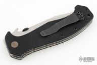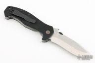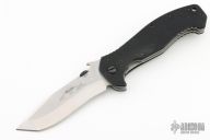 This CQC-15 SF from Emerson Knives has a two tone tanto recurve blade with thumb disc and notched thumb rest. Handle is black G10 with titanium liners, black barrel spacers, lanyard hole and tip up black stainless steel clip. Nice detent, lockup and blade seating. S/N 1713 and dated 2013. Comes with original box. Excellent condition.