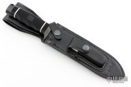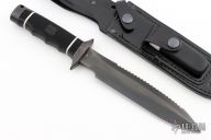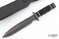 This Demo knife has a black spear point blade with serrations at top edge. Blade width is 7/32", depth is 1-1/4". Handle has stainless steel double guard and butt cap with lanyard hole. Comes with black leather sheath with button closure, belt loop and sharpening stone. Original Box. Excellent condition.