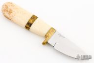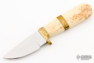 This skinner by Tiny Spencer features a mirror polished drop point blade, .158" blade stock and 1.201" blade depth, hidden tang construction. The handle has an engraved brass guard and spacer with a fossil walrus ivory grip. Includes a padded zippered case and papers. Excellent Condition.