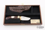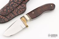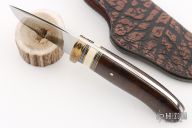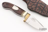 This fixed blade from Stephen Mackrill features a mirror finished drop point blade with .115" blade stock and 1.307" blade depth, full tang construction. The handle has a fluted brass guard, desert ironwood scales with a nickel silver escutcheon, black/white/brass/warthog tusk spacers, has twisted silver wire inlays on either side of the spine of the tang. Comes with original buffalo hide sheath, wooden box and COA dated 01/10/01. Excellent condition.