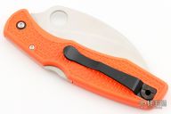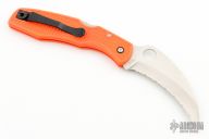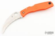 This SpyderHawk by Spyderco features a satin finished fully serrated hawkbill blade with thumbhole, orange FRN frame and black stainless steel tip up clip. Has a couple light scuffs, otherwise excellent condition.