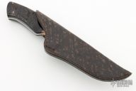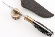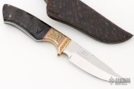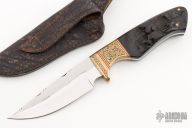 This fixed blade from Stephen Mackrill features a mirror finished drop point blade with fileworked spine, .114" blade stock and 1.341" blade depth, full tang construction. The handle has a engraved brass guard with red spacers, water buffalo horn scales with red and brass spacers, has twisted silver wire inlays on either side of the spine of the tang. Comes with original buffalo hide sheath, wooden box and COA dated 01/18/06. Excellent condition.