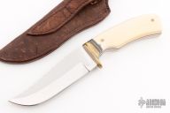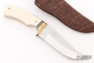 This fixed blade from Stephen Mackrill features a mirror finished drop point blade with fileworked spine, .122" blade stock and 1.459" blade depth, full tang construction. The handle has a fluted brass guard, hippo tooth scales with black/white/brass spacers, has twisted silver wire inlays on either side of the spine of the tang. Comes with original buffalo hide sheath, wooden box and COA dated 01/31/98. Excellent condition.