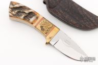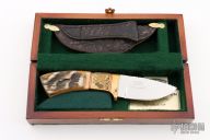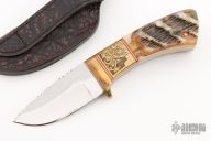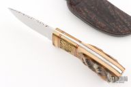 This fixed blade from Stephen Mackrill features a mirror finished drop point blade with fileworked spine, .112" blade stock and 1.326" blade depth, full tang construction. The handle has a engraved brass guard with red spacers, Water Buck horn scales with ivory paper micarta liners, red and brass spacers, has twisted silver wire inlays on either side of the spine of the tang. Comes with original buffalo hide sheath, wooden box and COA dated 01/18/06. Excellent condition.