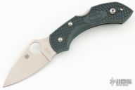 This Dragonfly II by Spyderco features a satin finished blade with thumbhole and notched thumbrest. The handle has green FRN scales, stainless steel backspacer, and a tip up clip, left or right reversible. Has a couple light scuffs, otherwise Excellent condition.