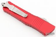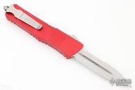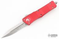 This Combat Troodon by Microtech Knives features a stonewashed double-edged partially serrated blade. The handle has a red aluminum frame with tip down blasted stainless steel clip and hardware. Comes with original box and papers. S/N 44047 and dated 08/2023. Excellent condition.