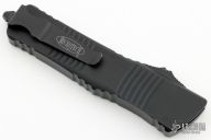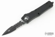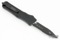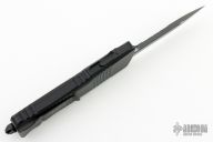 This Troodon OTF automatic features a double edged black blade with partial serrations. The handle is composed of black aluminum with a stainless steel clip. Glass breaker. S/N #42729, dated 06/2023. Excellent condition. Comes with original box and papers.