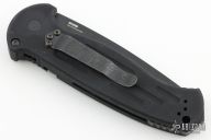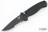 This 9051 AFO II auto from Benchmade has a black spear point partially serrated blade with false top edge. Black anodized aluminum handle. Integrated safety system. Black stainless steel clip - 4 way reversible, and lanyard hole. Comes with original box, papers and sheath. Excellent condition.