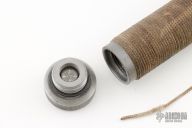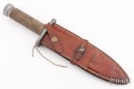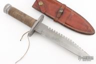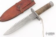 This knife by Mike England features a bead blasted blade with sawteeth on the spine and false top edge, .249" blade stock and 1.513" blade depth. The has a bead blasted stainless steel guard welded to a hollow stainless steel handle and blade, with nylon cord wrap, has removable bead blasted aluminum butt cap with compass. Comes with brown leather sheath. Has scuffs, scratches and patina, has been used and sharpened, otherwise fair condition.