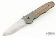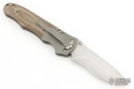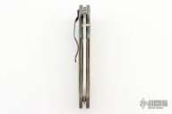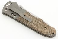 This ARS linerlock from A.R.S. Knives features a matte finished blade with swedge and single thumbstud. The handle is comprised of bead blasted and dovetailed titanium bolsters and green canvas micarta scales over bead blast titanium liners. Bead blast titanium tip down pocket clip. Good blade seating, detent and lock up. Has a few light scuffs, otherwise excellent condition.
