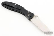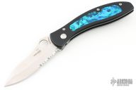This Spyderco Vesuvius top lock folder features a satin finished partially serrated blade with SpyderHole and notched thumbrest. FRN handle with abalone inlay, inset top liner lock. Tip up carry clip. Includes a black leather slip sheath.  Excellent Condition.