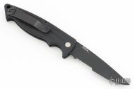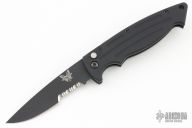 This Mini Reflex Auto by Benchmade features a black partially serrated blade and a black aluminum handle with black stainless steel tip up clip, lanyard hole at the butt and safety on the spine. Excellent condition.