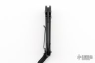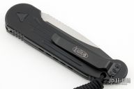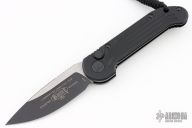 This LUDT side opening automatic by Microtech has a two-tone black blade with a standard edge and a black aluminum frame. This tactical version has black fittings. Stainless steel clip. Dated 02/2023 and serial number 30153. Comes with original box.  Excellent Condition.