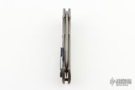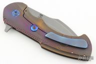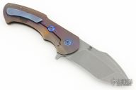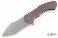 This Fallout mid-tech from Rick Barrett features a stonewashed/acid etched CPM35Vn blade. The handle scales are 3D sculpted titanium and have been anodized and lightly polished to further accentuate the 3D pattern/texture. The pivot, standoffs, and pocket clip are also anodized titanium. The pocket clip is positioned for tip up carry. Knife flips incredibly well on caged bearings. Great lockup, detent, and blade centering. Includes a padded zippered case.  Excellent Condition.