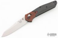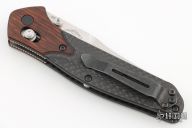 This Limited edition Osborne AXIS lock by Benchmade has a stonewashed drop point blade with dual thumbstuds.  The handle features wood bolsters and carbon fiber scales with a black steel tip up pocket clip.  Includes the original box, drawstring pouch and papers. Excellent Condition.