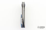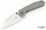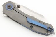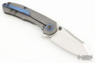This Coeus framelock flipper by Panos Evripiotis Blades & Tools features a satin finished blade with dual thumbstuds and flipper. The handle has an acid/tumble finished titanium frame and anodized tip up pocket clip, with matching pivot collars and backspacer . Nice action, blade seating and lockup. Comes with COA, and hard case. Excellent condition.