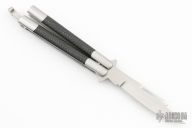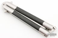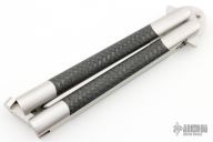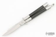 This balisong by 29 Knives features a satin finished drop point blade. The handle has integral 303 stainless steel handles with dovetailed carbon fiber Inlays, T-latch. Includes a padded zippered case, coa and the original box.  Has some scratches around the T-latch otherwise the knife is in Excellent Condition.