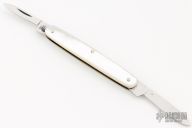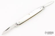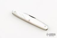 This Sleeveboard Pen Knife from George Wostenholm features polished blades with nail nicks. The handle has mother of pearl covers over brass liners and steel spring. Has some light scratches and patina, otherwise excellent condition for its age.