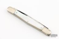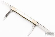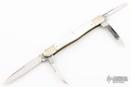 This 4-Blade Swell Center Congress from George Wostenholm features polished blades with nail nicks. The handle has fluted nickel silver bolsters and mother of pearl covers over brass liners and steel springs. Has half-stops. Has some light scratches and patina, otherwise excellent condition for its age.