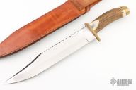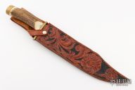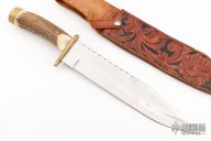 This bowie by WR Strom'n features a satin finished blade with false top edge and fileworked spine, .243" blade stock and 2.020" blade depth, hidden tang construction. The handle has a brass guard and butt with a stag grip. Comes with a hand tooled brown leather sheath and a zippered case. Dated 1993. Has some scratches and patina, the tip is blunted, otherwise good condition.