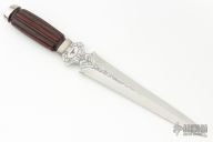 This Dagger by Bates features a mirror polished double edged blade with engraved flats, hidden tang construction, .247" blade stock and 1.696" blade depth. The handle has a nickel silver guard and butt cap with a fluted ironwood grip. Comes with a zippered case. Excellent condition. Engraving done by Bruce Shaw.