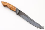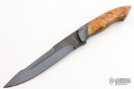 This fighter by William Herndon features a blued steel blade with a nearly sharpened top edge, .305" blade stock and 1.176" blade depth, full tang construction. The handle has an engraved blued steel grip with stabilized spalted wood scales with nickel silver pins. Comes with a zippered case. Excellent condition.
