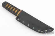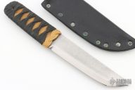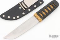 This Kwaiken by Phill Hartsfield features a satin finished chisel ground tanto blade, .127" blade stock and 1.231" blade depth, hidden tang construction. The handle has epoxied cord wrap over yellwo cord. Comes with a paper lined, black leather covered metal scabbard with clip. Excellent condition.