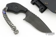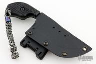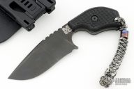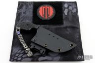 This SLCC by Mick Strider features a black drop point recurve blade with a notched thumbrest. .150" blade stock and 1.489" blade depth. The handle has a finger groove and ring. Has black G-10 Frag scales, from Monkey Edge. Comes with a kydex sheath and a velcro case. Has some scuffs and scratches, otherwise good condition.