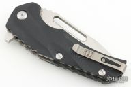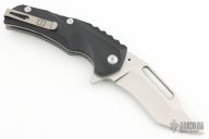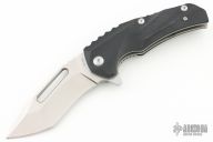 This Reloader from Brous Blades features a tumbled blade with thumbhole, flipper, and notched thumbrest. The handle has black G10 scales, titanium liners, black G-10 backspacer with groves, and a tip up stainless steel clip. Nice detent, lockup and blade seating. 185/500. Comes with original box and papers. Excellent condition.