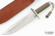 This MK4 by Newt Martin features a satin finished blade with sharpened top edge and sawteeth, .275" blade stock and 1.765" blade depth, hollow handle contruction. The handle has a stainless steel double guard with cord wrapped handle over hollow tang construction with a threaded removable butt cap with compass. Includes a brown leather sheath with belt loop. Excellent condition. "12" under ricasso.