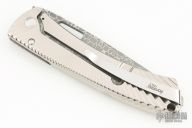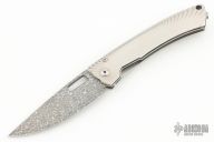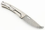 This frame-lock folder features a Damascus spear point blade with square thumb-hole and notched thumb-rest. The handle has a polished and milled integral titanium frame with tip up stainless steel clip. Has a very strong detent, perfect blade seating and lockup. Comes with tube and papers. Excellent condition.