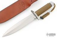This MK2 by Newt Martin features a satin finished double edged blade with .260" blade stock and 1.517" blade depth, hollow handle contruction. The handle has a stainless steel double guard with cord wrapped handle over hollow tang construction with a threaded removable butt cap with compass. Includes a brown leather sheath with belt loop. Excellent condition. "12" under ricasso.