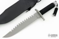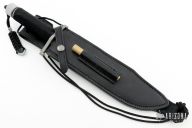 This MK1 Survival by Newt Martin features a bead blast finished blade with sharpened top edge and sawteeth, .275" blade stock and 1.530" blade depth, hollow handle contruction. The handle has a stainless steel double guard with cord wrapped handle over hollow tang construction with a threaded removable butt cap with compass. Includes a black leather sheath with belt loop. Excellent condition. "12" under ricasso.