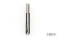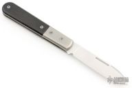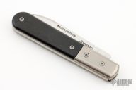 This Barlow by Lion Steel features a satin finished blade with nail nick. The handle has bead blasted titanium bolsters and liners, Ebony covers, satin finished stainless steel spring. Has half-stop, flush in all positions. Comes with original box and papers. Excellent condition.