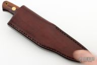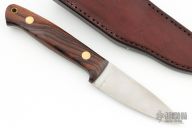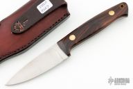 This knife by Steve Huey features a satin finished drop point blade with .094" blade stock and1.036" blade depth, full tang construction. The handle has cocobolo scales with brass pins and lanyard hole. Comes with a brown leather sheath. Has some light scratches, otherwise excellent condition.