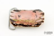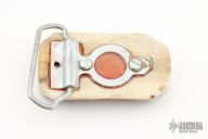 Custom sambar stag belt buckle with well done comical scrimshaw. Initials "D.K. '97" on the scrim. (please let us know if you know who this is). Lovely nude maiden being oggled by a satyr with a strategically placed bowler hat.