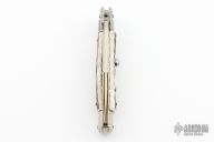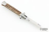 This Swivel Bolster features a bayonet style blade with false top edge. The handle has stainless steel bolsters and pommel with stag scales over brass liners and stainless steel backspacer. Excellent Condition.