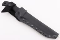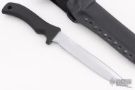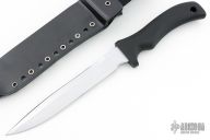This Shrike 7 by MadDog Knives has a hard chromed, double-edged blade with VVTL finish (very visible temper line) Razor sharp edges with a type 1 choil, the black handle material is the proprietary glass / epoxy composite -- compression bonded to the hidden full tang and incredibly ergonomic. 1/4" blade stock (stout!) and .974" blade depth. Mad Dog trademark on the ricasso – it is the PERFECT knife for everyday carry.  The handle is designed to be ergonomic and has the ability to withstand tremendous punishment with little or no damage. It is hard and tough enough to be used as an impact tool. Includes a kydex sheath. Excellent condition.