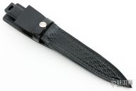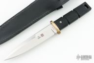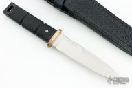 This Shugoto by Al Mar features a satin finished spear point blade with false top edge, .191" blade stock and 1.120" blade depth, hidden tang construction. The handle has a brass guard, black checkered FRN grip, lanyard hole at the butt. Comes with tooled black leather sheath. Has some light scuffs, scratches, and patina. Great condition otherwise.