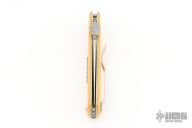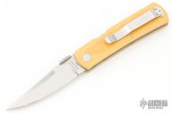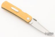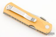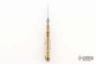This lockback by Harvey Otis McBurnette features a hand rub satin finished blade with swedge and a checkered thumbstud. The handle has antique yellow paper micarta covers with fileworked nickel silver liners, fileworked stainless backspacer. Rear checkered post pushes out to reveal a small toothpick. Nice lockup, function and blade seating. Has some light scuffs and scratches, excellent condition otherwise.