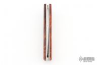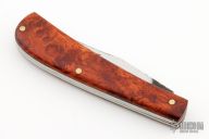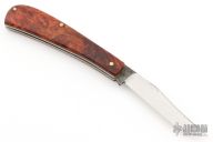 This Trapper Slipjoint by Last Knives features a satin finished blade with nail nick. The handle has Red Amboyna burl wood covers with brass pins and stainless steel liners and spring. Has half-stop, flush in all positions. Comes with a COA. New from maker.