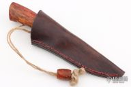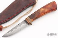 This Utility EDC by Last Knives features a hand forged hand rub satin finished blade with a nice hamon, .132" blade stock and .663" blade depth, hidden tang construction. The handle has a textured copper and brass guard, Amboyna burl wood grip. Comes with a brown leather sheath and COA. New from maker.