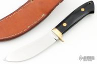 This Nessmuk Skinner by Joe Cordova features a mirror polished blade with .201" blade stock and 1.219" blade depth, full tapered tang construction. The handle has a brass guard, black linen micarta scales and red and brass liners. Lanyard hole at the butt. Comes with a hand tooled brown leather sheath and zippered case. Has a few light scratches, otherwise excellent condition. #346