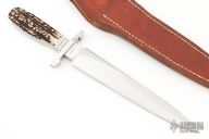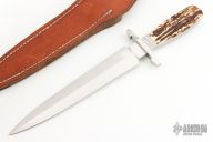 This Arkansas Toothpick by Herman Schneider is the only one he ever made. It features a hand rubbed satin finished double edged blade, .233" blade stock, 1.507" blade depth, hidden/frame tang construction. The handle has a satin finished stainless steel guard and fluted collar, stag scales and a stainless steel frame. Comes with a brown leather sheath. Also comes with the July 1990 issue of "The Cutting Edge" where this knife is featured on the back cover. Excellent condition.