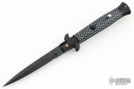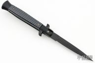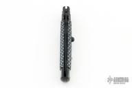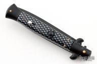 This Swivel Bolster features a black flat ground blade. The handle has black stainless bolsters, front and rear, carbon fiber scales, brass liners, stainless spring. Comes with zipper case. Has some light scratches, excellent condition otherwise.