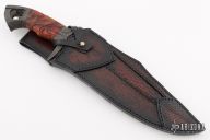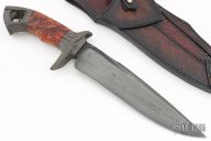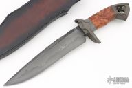 This URSA Special Bowie by Last Knives features a hand forged from Aldo's W2 blade with nice hamon and sharpened top edge, .279" blade stock and 1.821" blade depth, hidden takedown tang construction. The handle has carved and parkerized mild steel guard and butt, carved Red Amboyna burl wood grip. Comes with a hand tooled leather sheath and COA dated November 11, 2023. New from maker.
