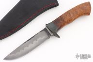 This Gondar by Last Knives features a hand forged hand rub satin finished blade with a nice hamon, .232" blade stock and 1.076" blade depth, hidden tang construction. The handle has a blued mild steel guard and a Teak burl wood grip. Comes with a black leather sheath and COA. New from maker.