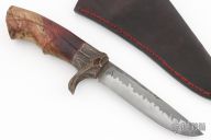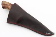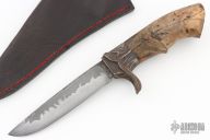 This Gondar by Last Knives features a hand forged hand rub satin finished blade with a nice hamon, .196" blade stock and 1.019" blade depth, hidden tang construction. The handle has a carved mild steel guard and a two-tone Amboyna burl wood grip. Comes with a black leather sheath and COA. New from maker.